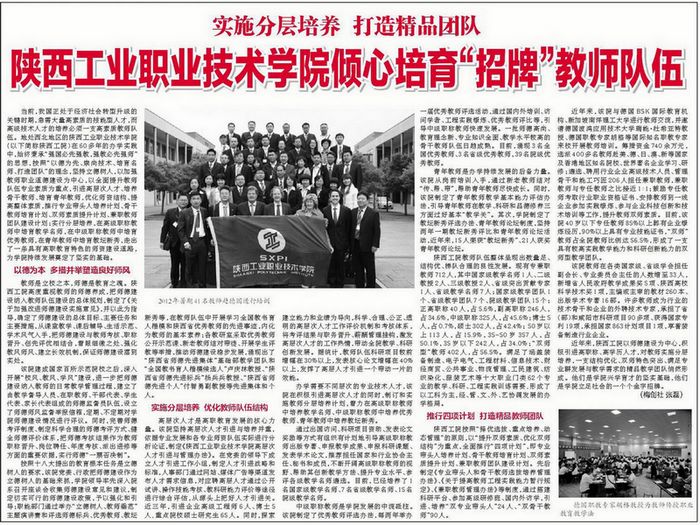 7月28日,《陕西日报》第四版刊发了题为《实施分层培养,打造精品团队——陕西工业职业技术学院倾心培育“招牌”教师队伍》的文章,该文从“以德为本,多措并举塑造良好师风”、“实施分层培养,优化教师队伍结构”、“推行四项计划,打造精品团队”三个方面,全面展示了我院在师资队伍培养方面的有力举措和显著成效,引起媒体和社会的广泛关注。