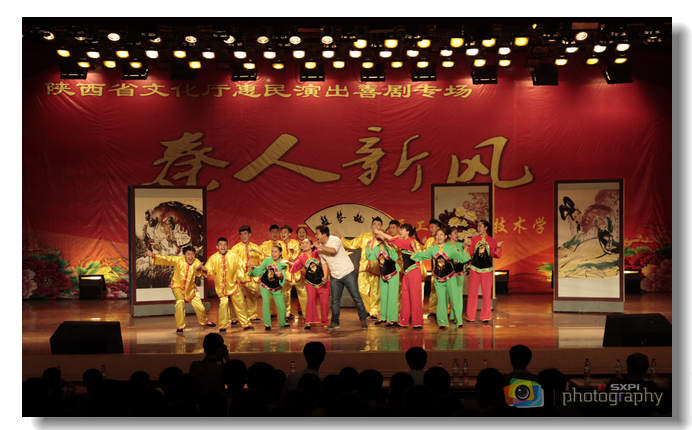 演出舞台上,主持人与我院学生趣味互动,赢得全场阵阵掌声,吼一声秦腔《陕西人》演出开场,以秦韵秦风的陕西话歌曲感染,民间百态的老百姓同台同唱同演,体现淳朴的陕西民风民情,热闹的开场在舞台声光电的配合下美不胜收。接下来,小品《少管所》通过管教与失足青年的对话故事,反映了青少年教育是全社会关注的问题,诙谐幽默,引人深思。《办公室的故事》通过一个信访干部和农村妇女蛮不讲理来闹事的一段趣事,反映一个全心全意为人民服务的好干部。《可爱的局长》通过上门采访某局长的记者和一位时常冒傻气的局长妻子之间的对话,笑料迭出。整台演出的五个小品,从不同侧面展现了新时期的美好生活,同时,还穿插着舞蹈《民族风》、歌曲《公仆心》,魔术表演等,精彩的演出使得现场笑声、掌声融合在一起,成了欢乐的海洋。以著名书画家王西京、刘文西、罗国士、吴三大等名家字画做的舞台装饰,体现了三秦文化和戏剧的结合,更反映了三秦文化的深厚底蕴。最后,演出在舞蹈《和谐家园》欢快的旋律中落下帷幕。晚会形式新颖、清新大气,演员们精彩的表演深深地吸引了观众,幽默的陕西方言更是让观众倍感亲切,陕西方言的台词,有着浓郁的三秦味道的“秦人新风”精彩的演出给我院师生留下了深刻的印象