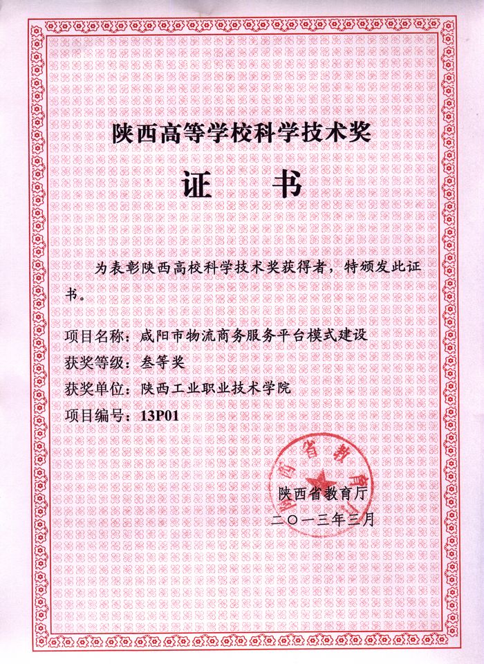 近日,根据陕西省教育厅《关于公布2013年度陕西高等学校科学技术奖获奖项目的通知》(陕教技【2013】6号)文件精神,由学院科研处组织申报、李选芒教授主持完成的“咸阳市物流商务服务平台模式建设”科研项目,经过专业评审组评审,评审委员会综合审核,最终获得“二〇一三年度陕西高等学校科学技术奖励”三等奖,这是继2009年获奖后学院获得的又一殊荣。
