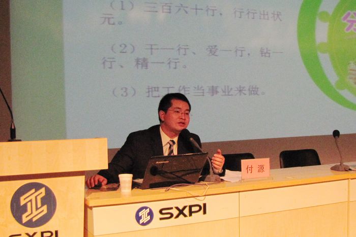 10月23日下午,我院邀请咸阳亿龙地产营销经理、西安博朗置业有限公司营销总监付源为400余名学生作题为《轻松就业、快乐成长》的主题讲座。该讲座由就业指导处主办、电气工程学院承办,就业指导处副处长郝军、电气工程学院总支书记万可顺、学工办主任白国政参加了讲座。讲座由万可顺主持。