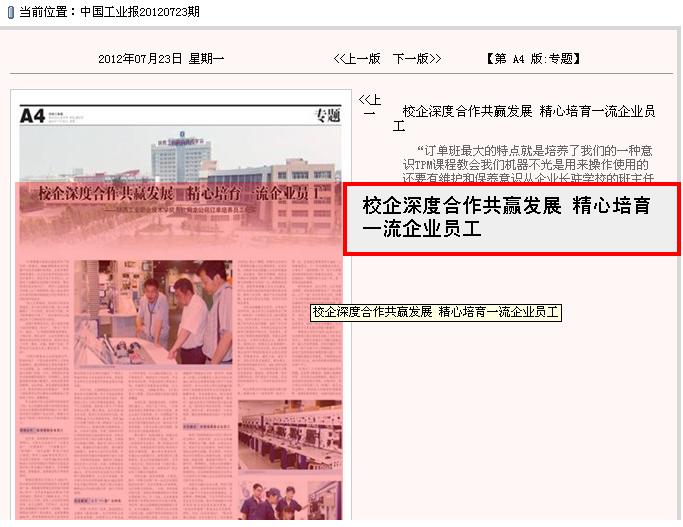 7月23日,《中国工业报》第四版以《校企深度合作共赢发展 精心培育一流企业员工》为题,报道了我院与欧姆龙公司订单培养学生,反映我院以服务学生就业为导向,以教育教学质量提升为核心,以促进学生持续发展为目标的“订单式”人才培养模式。