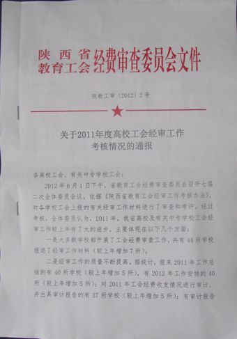 我院工会荣获2011年度陕西省“高校工会经审工作二等奖”