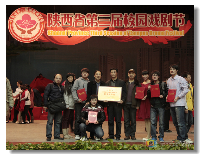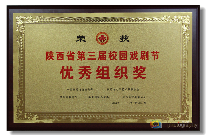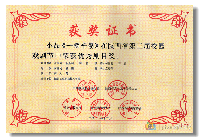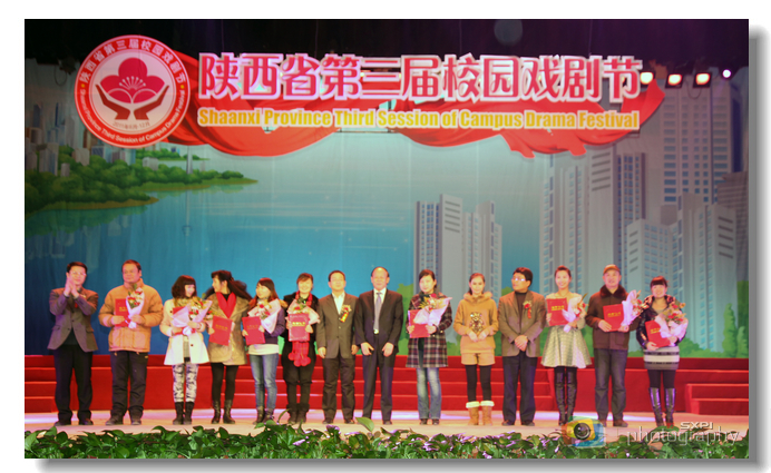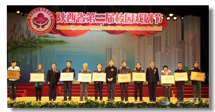 12月8日晚,由陕西省委宣传部、省文联、省教育厅等多家单位主办的陕西省第三届校园戏剧节颁奖晚会在西安举行,来自全省30余所参演院校的相关负责人、学生代表等千余人出席了颁奖活动。本届艺术节共评出4个优秀剧本奖、7个优秀剧目奖、7个优秀演出奖。我院选送的小品《一顿午餐》和《一张饭卡》分别获得优秀表演奖和优秀剧目奖,我院同时获得优秀组织奖。党委副书记王天哲、学工部部长王超联等出席了颁奖晚会,小品《一张饭卡》还参加了闭幕式优秀剧目展演。