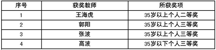 11月29-30日,陕西省教育厅主办的2011年陕西省普通高等学校体育教师技能大赛在陕西科技大学落下帷幕,全省50多所高校的200多名体育教师参加了比赛。大赛分体育理论、计算机应用基础、身体素质和专项体育技能四个部分,郭阳、王海虎、张波、高波组成的我院体育教师代表队,经过积极努力、顽强拼搏,最终获得个人二等奖1项、三等奖3项,并取得高职高专组“团体优胜奖”。