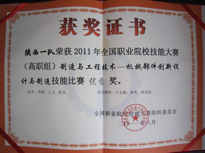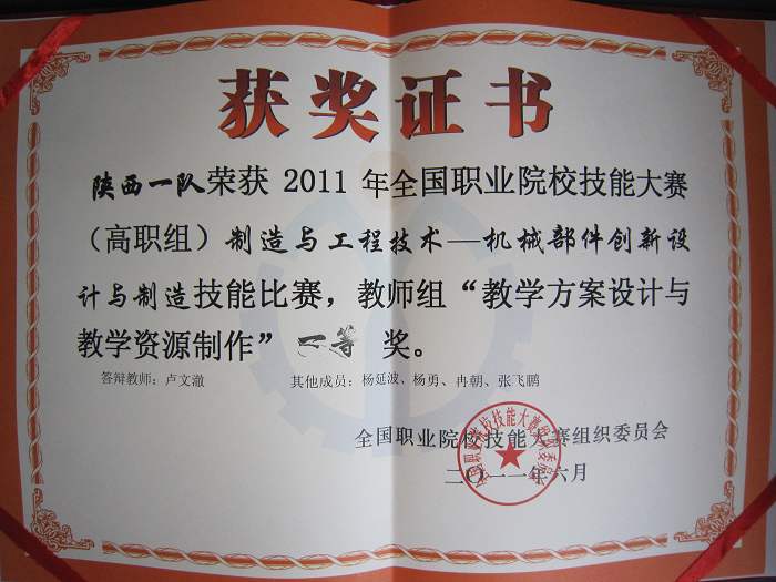 来自全国各地27个省、直辖市、自治区的42支代表队参加了本项目比赛,经过紧张激烈的角逐,由我院数控0801班陈龙、数控0802班王飞、数控0805班李超组成的陕西一队获得学生组优秀奖,由数控学院卢文澈老师负责,杨延波、杨勇、冉朝、张飞鹏四位老师参与的“风力推料机”教学方案设计与教学资源制作获得教师组一等奖。