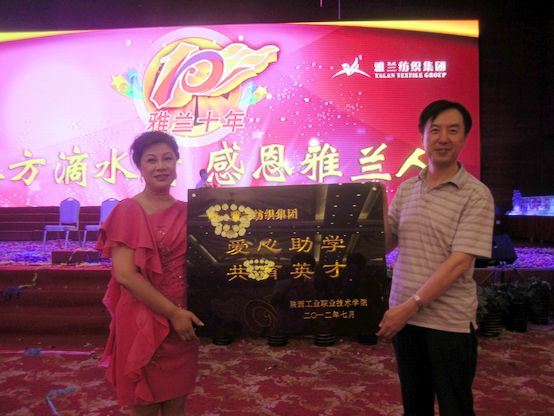 7月27日,雅兰纺织集团十周年庆典在西安曲江隆重举行。我院作为企业合作单位,应集团邀请,副院长王津教授,校企合作处、纺织染化学院相关领导与省市领导、知名企业、全国客户及雅兰全体员工欢聚一堂,共贺雅兰成立十周年。