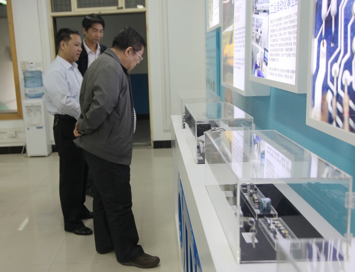 4月28日下午,学院党委书记邓志辉、院长崔岩在“SXPI-OMRON(陕西工院-欧姆龙)工业自动化实训中心”检查指导建设工作。