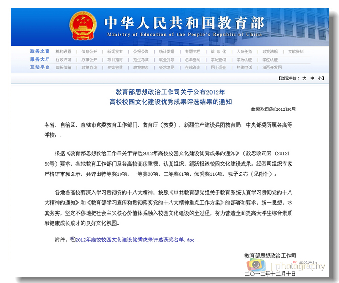 近日,根据教育部思想政治工作司《关于公布2012年高校校园文化建设优秀成果评选结果的通知》(教思政司函[2012]91号)精神,我院组织申报的《精心打造高职特色美育模式,全面提升高职人才培养质量》获得“2012年高校...
