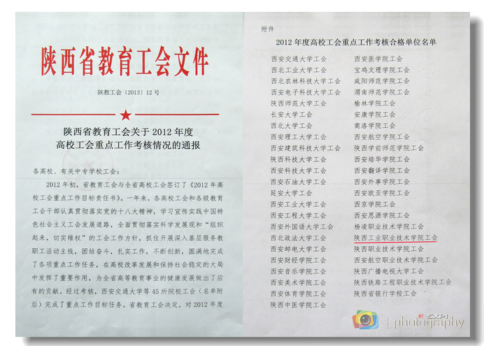 日前,陕西省教育工会下发陕教工字[2013]12号文件,通报了2012年度高校工会重点工作考核的情况,我院工会等全省45所院校圆满完成年度重点工作目标任务,经考核合格,并按照相关规定予以表彰奖励。