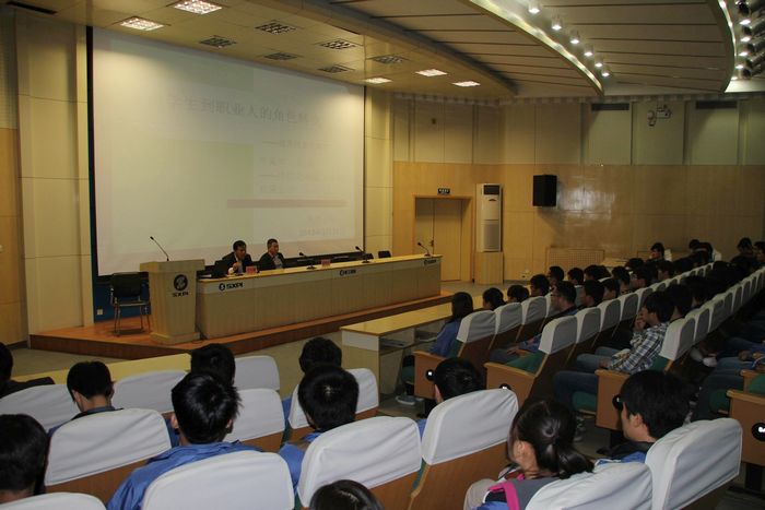 3月31日,优秀校友李振华走进校友大讲堂,为我院电气工程学院2011级400名学生上了一堂精彩的就业指导课。