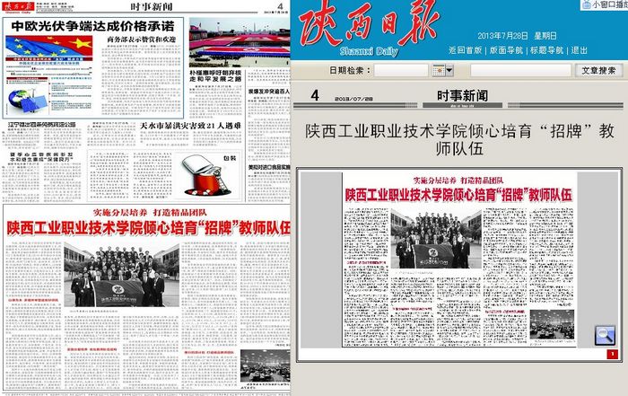 7月28日,《陕西日报》第四版刊发了题为《实施分层培养,打造精品团队——陕西工业职业技术学院倾心培育“招牌”教师队伍》的文章,该文从“以德为本,多措并举塑造良好师风”、“实施分层培养,优化教师队伍结构”、...