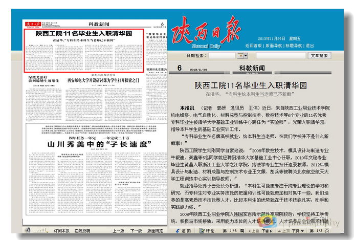 11月26日,《陕西日报》科教版头条以“陕西工院11名毕业生入职清华园”为题刊发消息,对我院教育教学改革、毕业生就业等工作进行报道。