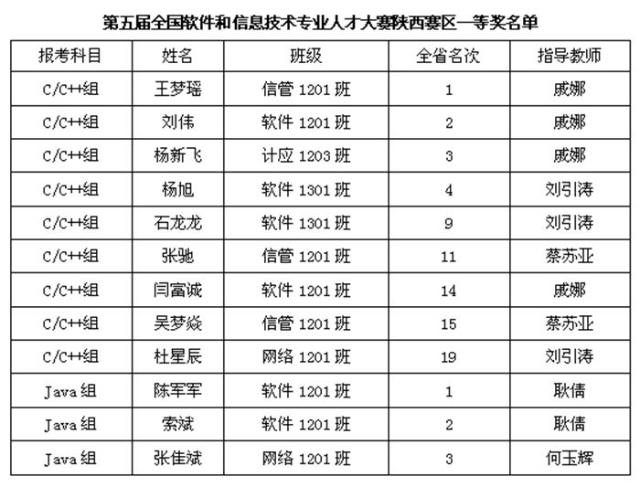 4月2日,从全国软件和信息技术专业人才大赛组委会获悉,我院信息学院学生荣获陕西赛区一等奖12项(全省共26项),二等奖7项,三等奖3项;获得一等奖的12名同学还将于5月底参加在北京大学举行的全国总决赛。