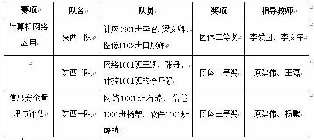 6月27日,在全国职业院校技能大赛中我院三支代表队代表陕西省参赛,分别荣获“计算机网络应用”和“信息安全管理与评估”赛项2个团体二等奖和1个团体三等奖。